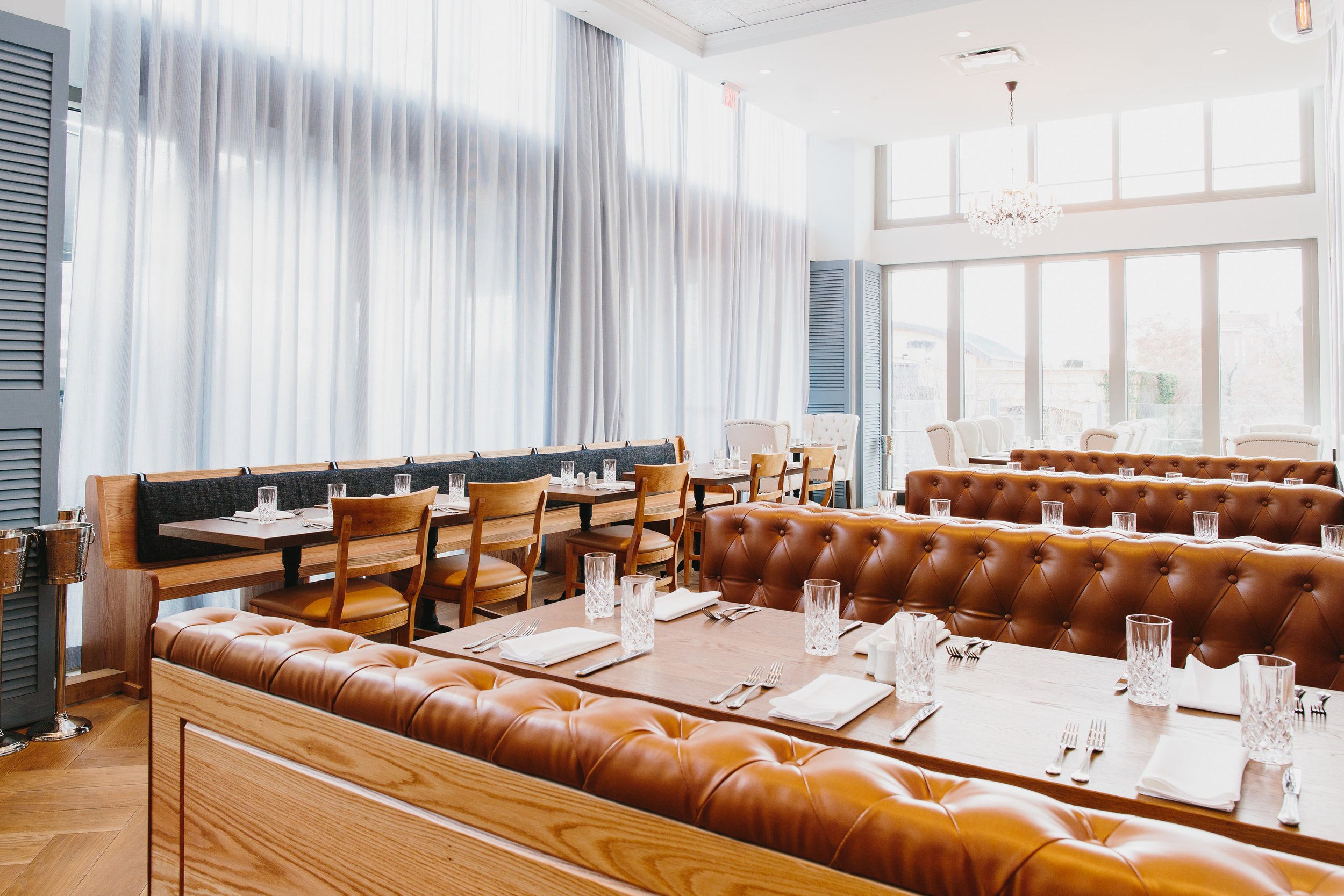 The gorgeous top floor space in the Buckhead Village District was designed by New York’s Lacina Heitler, and features classic, Southern touches done in surprising, modern ways: seersucker window treatments, tufted camel leather booths, vintage plateware, white marble countertops, vaulted ceilings, herringbone floors, dramatic chandeliers, complete with an oversized portrait of Mark Twain painted by a commissioned local artist.
